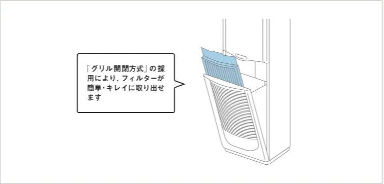 また 「グリル開閉方式」 の採用で、 フィルターに付着したチリ・ホコリが舞いにくく、取り出しもスムーズです。